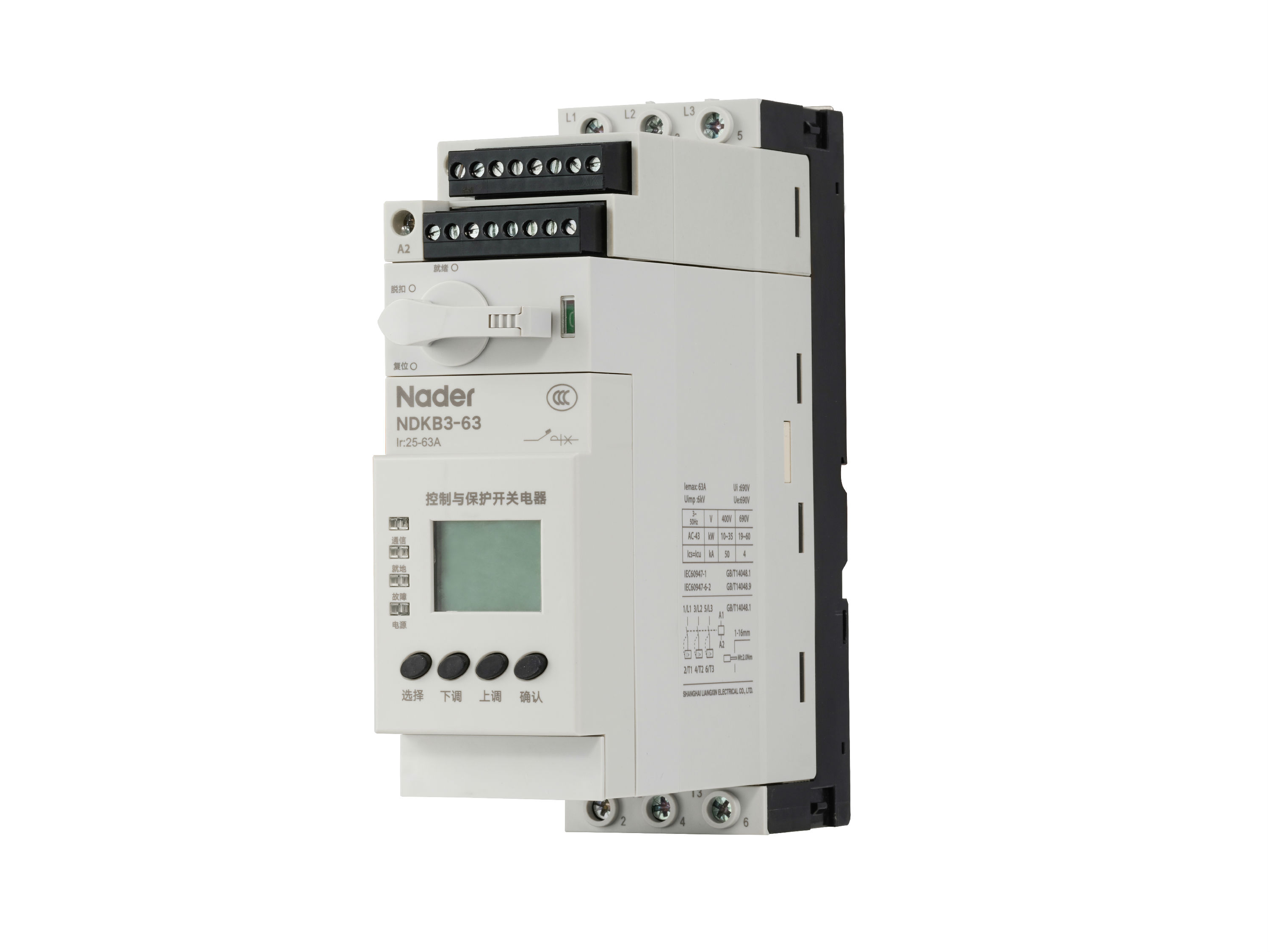 NDKB1系列控制与保护开关电器主要用于交流50Hz、额定工作电压至690V、额定工作电流1A至125A 、控制器整定电流0.4A至125A、控制电机功率0.12kW至55kW的电路中,能够接通、承载和分断正常条件下(包括规定的过载条件)的电流,也能接通、承载一定时间和分断规定的非正常条件下(如短路)的电流。 NDKB3系列控制与保护开关电器主要应用于交流50Hz、额定工作电压690V及以下、额定工作电流0.3A~63A的低压配电与电动机控制与保护电路。